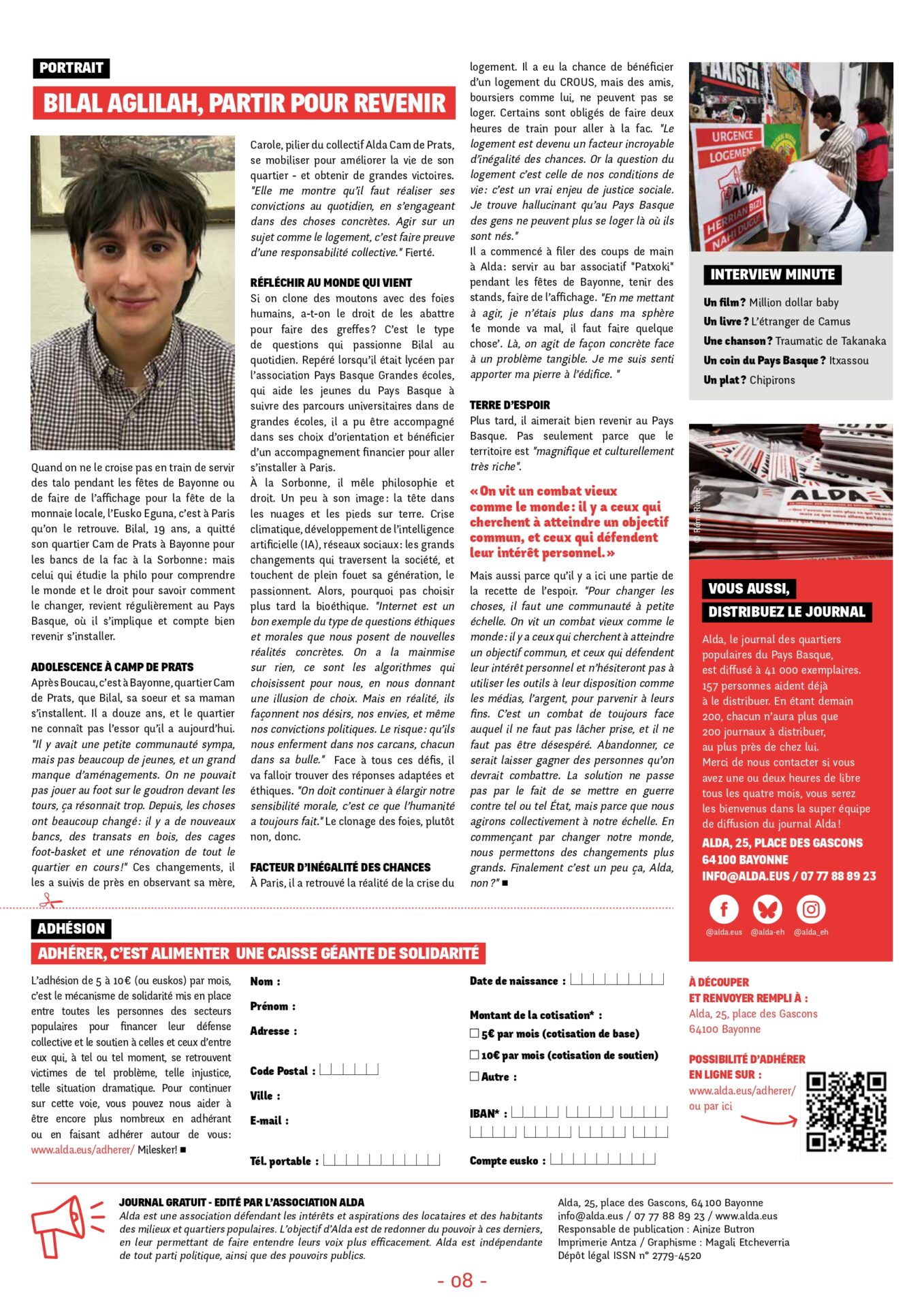 Quand on ne le croise pas en train de servir des talos pendant les fêtes de Bayonne ou de faire de l’affichage pour la fête de la monnaie locale, l’Eusko Eguna, c’est à Paris qu’on le retrouve. Bilal, 19 ans, a quitté son quartier Cam de Prats pour les bancs de la Sorbonne : mais celui qui étudie la philo pour comprendre le monde et le droit pour savoir comment le changer, revient régulièrement au Pays Basque, où il s’implique et compte bien revenir s’installer.